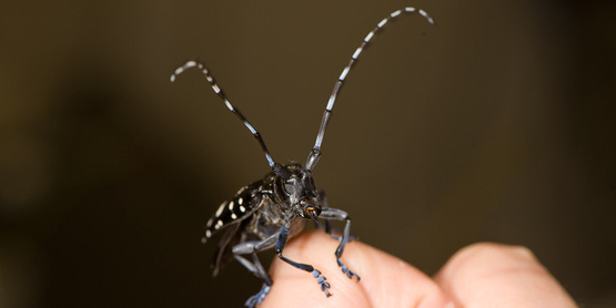 The Asian Longhorned Beetle (Anoplophora glabripennis) was introduced from Asia to the U.S. with the first breeding populations found in NY State in 1996 (USDA). It is a wood-boring pest that attacks maples and other hardwood trees.