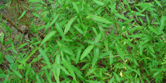 Japanese Stiltgrass (Microstegium vimineum ) was probably introduced to the U.S. as packing material in crates from China. It can grow in a variety of habitats where it forms dense stands and crowds out native species ( from USDA Plant Profiles)